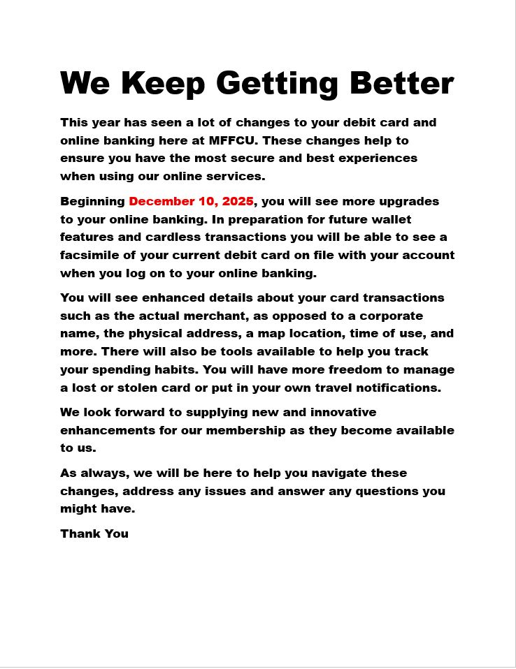 Reap the benefits of being a member of MFFCU! Banking with us gives you opportunities and rewards that are unmatched.